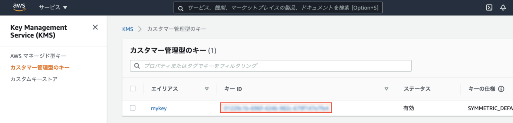 画像内の赤枠で囲っている部分が `–kms-key-id` で必要なパラメータになります。